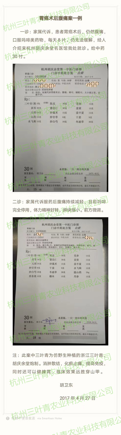 以下是医生将我们三叶青堂提供、胡庆余堂炮制的三叶青应用于胃癌术后病人的一个案例。