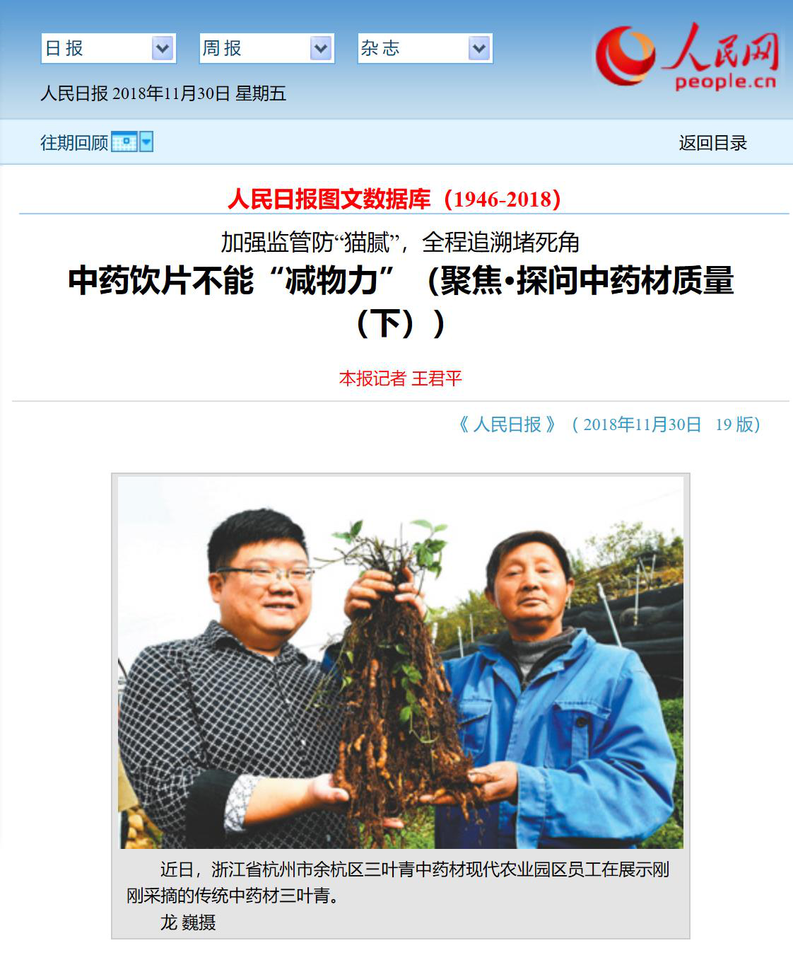 2018年11月30日,《人民日报》19版刊登了一篇名为《加强监管防“猫腻”,全程追溯堵死角——中药饮片不能“减物力”(聚焦·探问中药材质量(下))》的文章,主要对目前国内的中药材质量问题进行了深入探讨,并将我们杭州三叶青农业科技有限公司作为诚信经营典代表(文章配图为在我公司“杭州市余杭区三叶青中药材现代农业园区”里所拍摄的三叶青展示照片)。